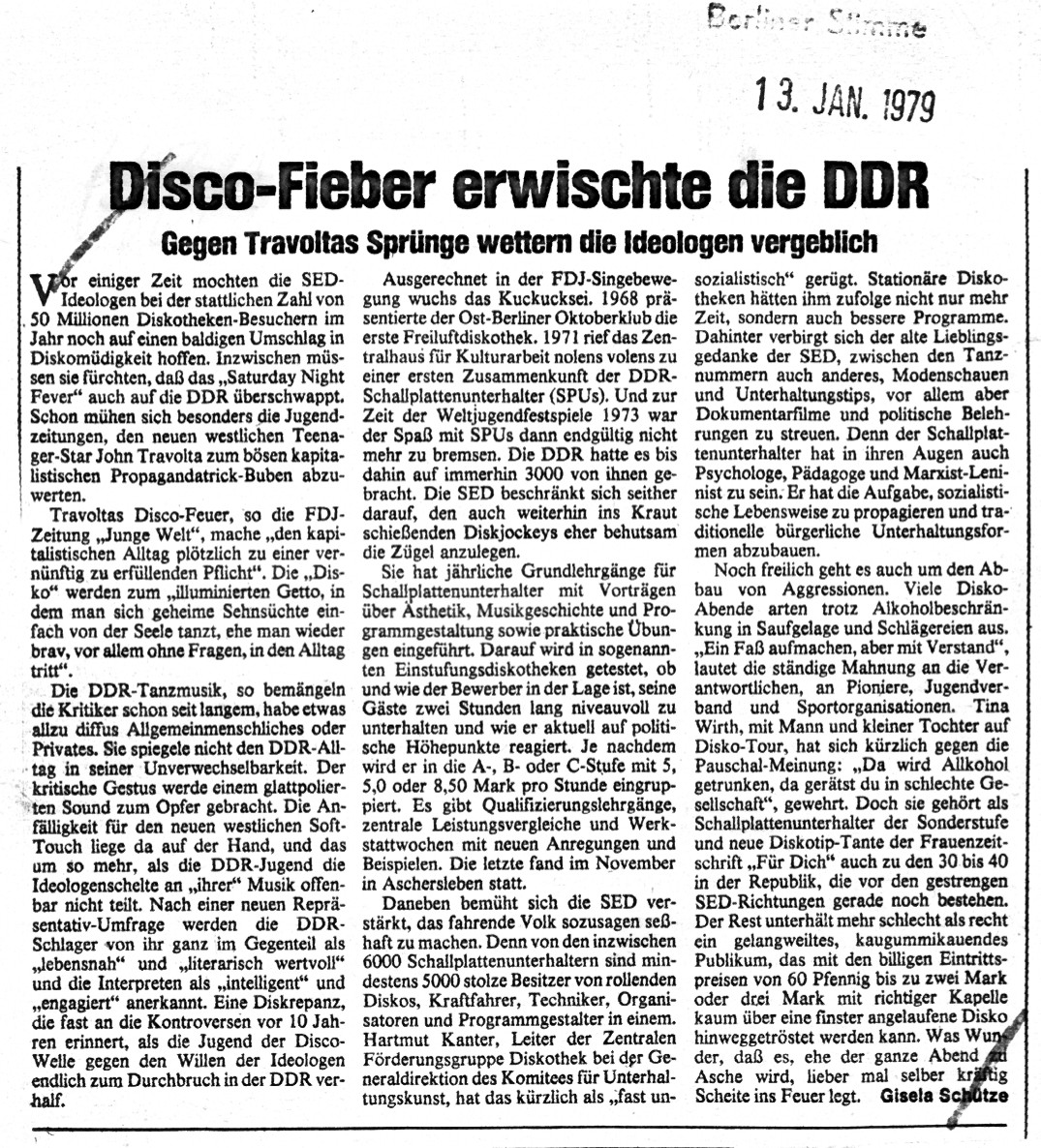 Die FDJ-Zeitung, heute linke Tageszeitung "Junge Welt" schreibt noch 1978 "Travolta - mag er noch so gut singen, tanzen und spielen, wurde zum erneuten Beweis dafür, mit welcher Differenziertheit die Ideologen des Kapitals die Register ihrer Propaganda ziehen: Travoltas Disco-Feuer, seine Rock-Romantik macht den kapitalistischen Alltag plötzlich zu einer vernünftig zu erfüllenden Pflicht, die Disco wird zum einzigen Tummelplatz des Glücks", und weiter, sie sei ein glitzerndes "Getto, in dem man sich geheime Sehnsüchte einfach von der Seele tanzt, ehe man wieder brav, vor allem ohne fragen in den Alltag tritt" Übrigens hatten die SED Medien auch Elvis und die Beatles zu Anfang bekämpft um sich dann später damit abzufinden und sogar "fortschrittliche Züge" zu entdecken.
